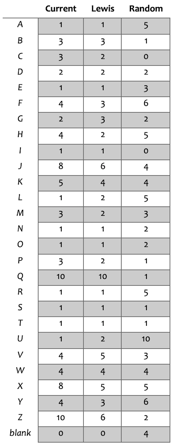 拼字游戏(Scrabble)的创始人阿尔弗雷德·巴茨(Alfred Butts)在20世纪30年代通过研究字母频率(包括报纸头版发表的文章)首次手工确定了这些字母的价值纽约时报.刘易斯计算了瓷砖的新值,理由是80年后,随着新单词被收入词典,Scrabble可以进行更新。他编写了一个程序,利用多种指标,考虑一个字母在字典中的频率和典型的单词长度,来计算放置它的难度。他的结果例如,建议“Q”保持在10点,但“Z”降至6点。